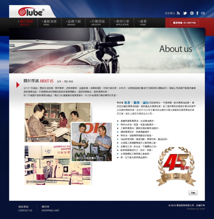 全部作品 精選作品 企業形象 購物網站 投審稿系統 客製平台 醫療美容 餐飲旅宿 教育/協會/政府 活動網站 RWD響應式 賀卡 3D環景攝影 首頁 iWare作品 厚誠貿易 厚誠貿易 介紹 從1971年創始,引進國外最新潤滑油產品,提供油脂、金屬加工油、液壓油、食品級潤滑油、機油、清潔劑、油品分析 產業分類 企業形象 RWD響應式 病例登錄系統 客製平台 APSC 2018 RWD響應式 投審稿系統