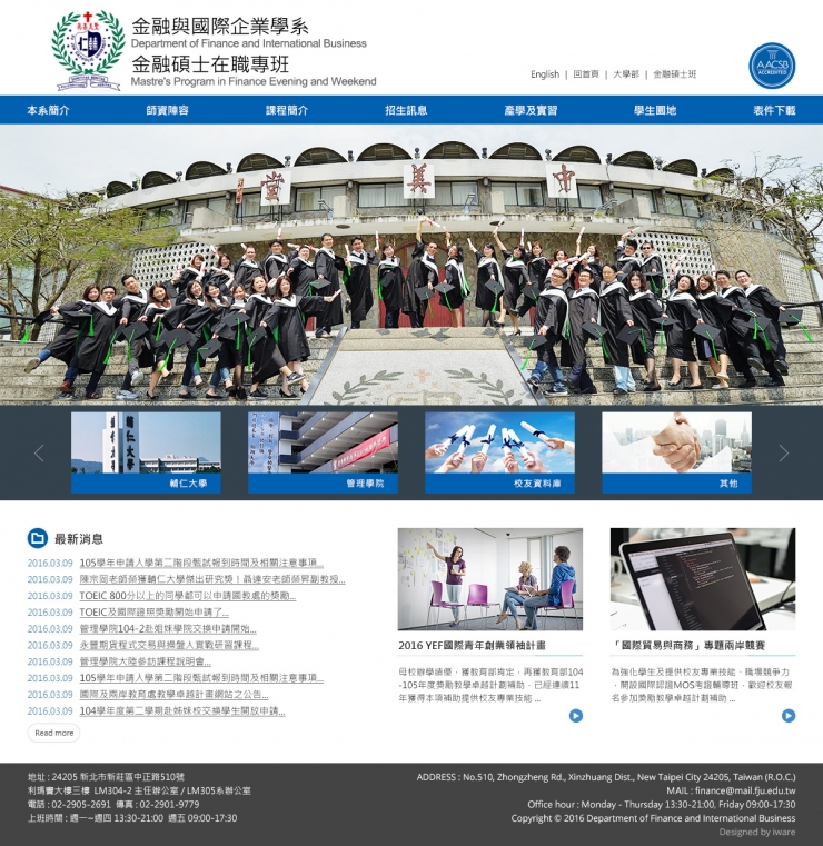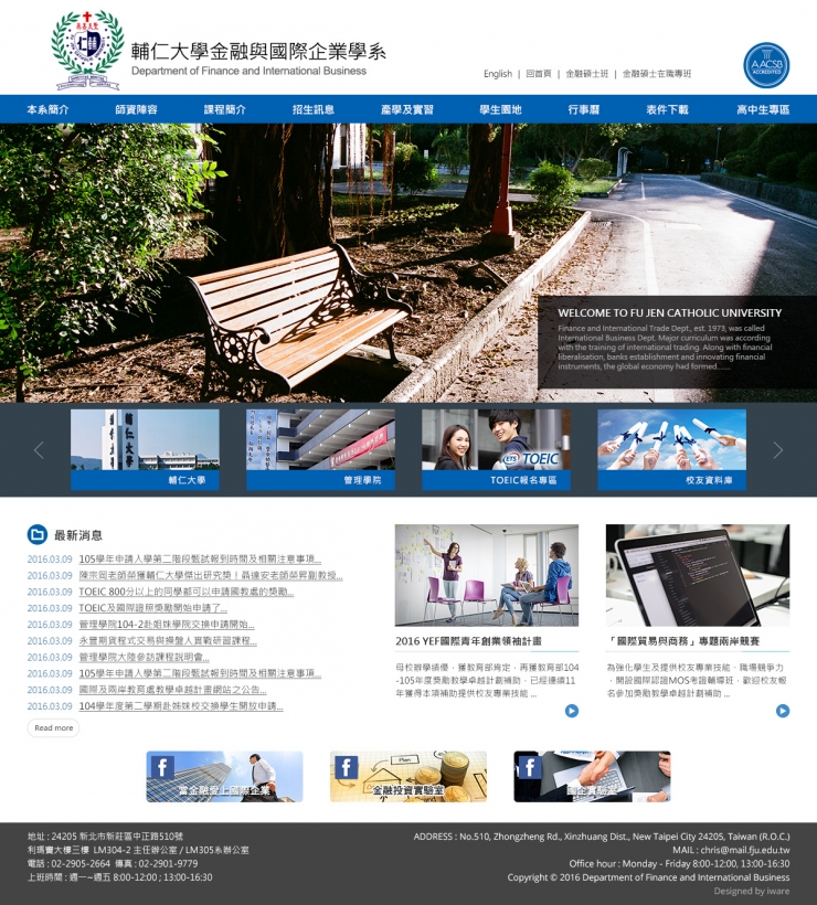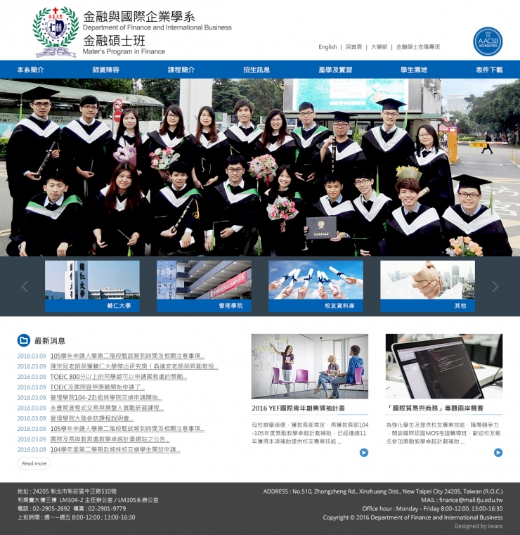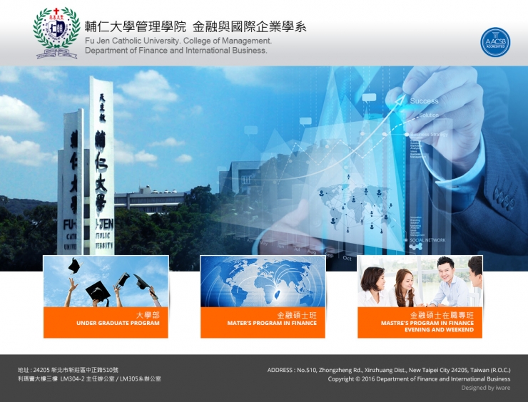 全部作品 精選作品 企業形象 購物網站 投審稿系統 客製平台 醫療美容 餐飲旅宿 教育/協會/政府 活動網站 RWD響應式 賀卡 3D環景攝影 首頁 iWare作品 輔仁大學 金融與國際企業學系 輔仁大學 金融與國際企業學系 介紹 輔仁大學金融與國際企業學系成立於1973年,當時稱為國際貿易學系,課程安排以國際貿易之訓練為主。隨著金融自由化、銀行設立解禁,金融工具不斷地創新,衍生出各種複雜且高度財務槓桿的金融商品,對經濟發展具有「水能載舟,亦能覆舟」之巨大力量。為了加強金融研究的縱深,本系在2010年與金融所合併為一,並再次更名為「金融與國際企業系」。在課程設計上,將金融與國際企業兩個熱門領域結合,目標是培育「國際級企業之財務與管理人才」。 產業分類 教育/協會/政府 2018 馬路科技賀卡 賀卡 馬路科技2018 聖誕佳節賀卡 賀卡