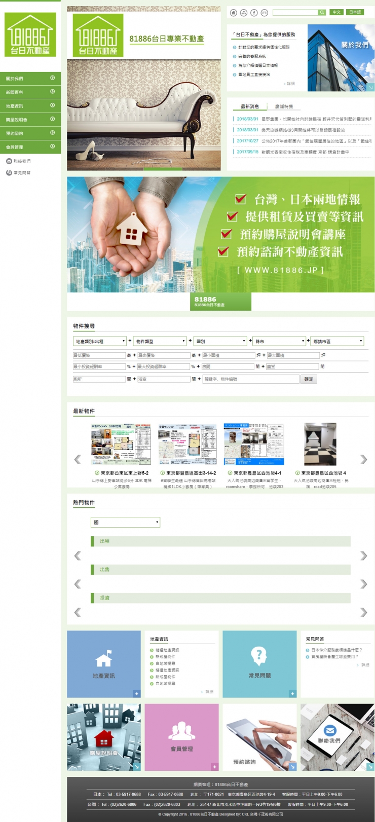 全部作品 精選作品 企業形象 購物網站 投審稿系統 客製平台 醫療美容 餐飲旅宿 教育/協會/政府 活動網站 RWD響應式 賀卡 3D環景攝影 首頁 iWare作品 台日不動產 台日不動產 介紹 台日不動產秉持著「安全、專業」態度, 用「準確」、「快速」、「誠信」、「穩健」的經營理念, 協助更多外國人順利地在日本找到屬於自己的家。 在買賣租屋過程中,提供安心與安全的交易服務, 以專業的態度,用心達成每個客戶的需求。 同時提供日本不動產市場最新資訊, 配合客戶的需求及預算, 為您找到最適合的夢想住宅、優質投資物件。 我們為您找得不只是房子, 而是溫暖的家、溫馨的避風港, 讓您在日本創造另一個家的回憶。 功能項目 篩選搜尋 產業分類 企業形象 RWD響應式 群登科技 精選作品 RWD響應式 台灣樂樂文化 購物網站 RWD響應式 教育/協會/政府