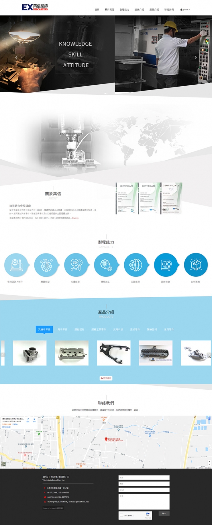 全部作品 精選作品 企業形象 購物網站 投審稿系統 客製平台 醫療美容 餐飲旅宿 教育/協會/政府 活動網站 RWD響應式 賀卡 3D環景攝影 首頁 iWare作品 葉信工業 葉信工業 介紹 葉信工業股份有限公司創立於1984年,專精於鋁鋅合金壓鑄,代客設計鋁合金壓鑄模具和製造。並對一系列諸如汽車零件、醫療設備零件及LED燈殼提供完整壓鑄方案。 葉信為一家專業鋁合金壓鑄產品OEM製造商,現有產品超過80%銷往世界各地,包括日本、美國、加拿大、德國、瑞士、芬蘭等市場。 製作團隊:規劃/Kanie, 設計/Patty, 前端/Michelle 產業分類 企業形象 RWD響應式 台灣樂樂文化 購物網站 RWD響應式 教育/協會/政府 金門縣政府地方產業創新研發計畫 RWD響應式 教育/協會/政府