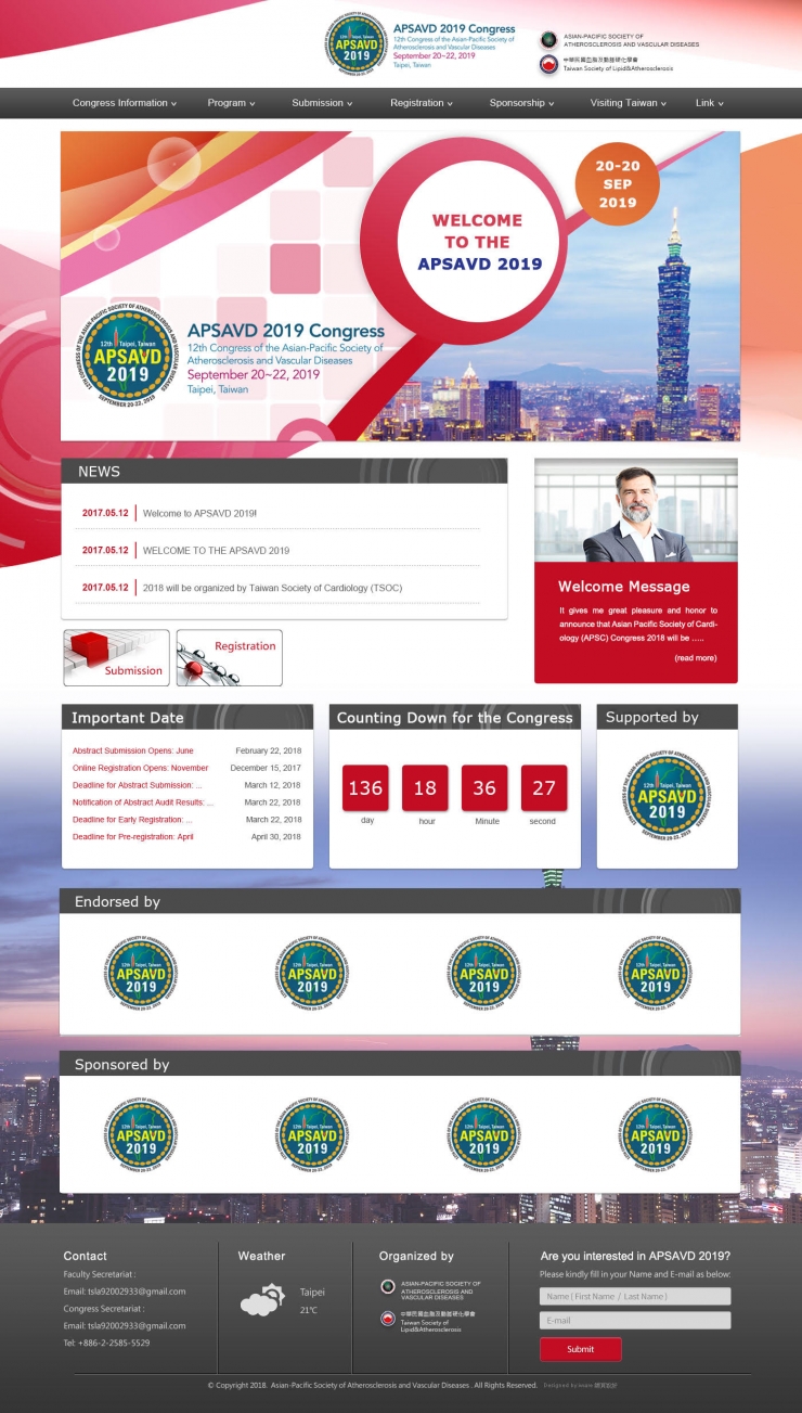 全部作品 精選作品 企業形象 購物網站 投審稿系統 客製平台 醫療美容 餐飲旅宿 教育/協會/政府 活動網站 RWD響應式 賀卡 3D環景攝影 首頁 iWare作品 APSAVD2019研討會(2019亞太地區動脈粥樣硬化和血管研討會) APSAVD2019研討會(2019亞太地區動脈粥樣硬化和血管研討會) 介紹 年度研討會議相關資訊的佈達 包含議程資訊相關內容 製作團隊:規劃/Hannah, 設計/Karen, 程式/Joe 功能項目 研討會形象官網 議程相關 會議相關資訊佈達 贊助廠商呈現 提供國外與會人員旅遊資訊參考 產業分類 醫療美容 RWD響應式 亞太心臟病學會-2018研討會官網 醫療美容 RWD響應式 禾同法律事務所 企業形象 教育/協會/政府