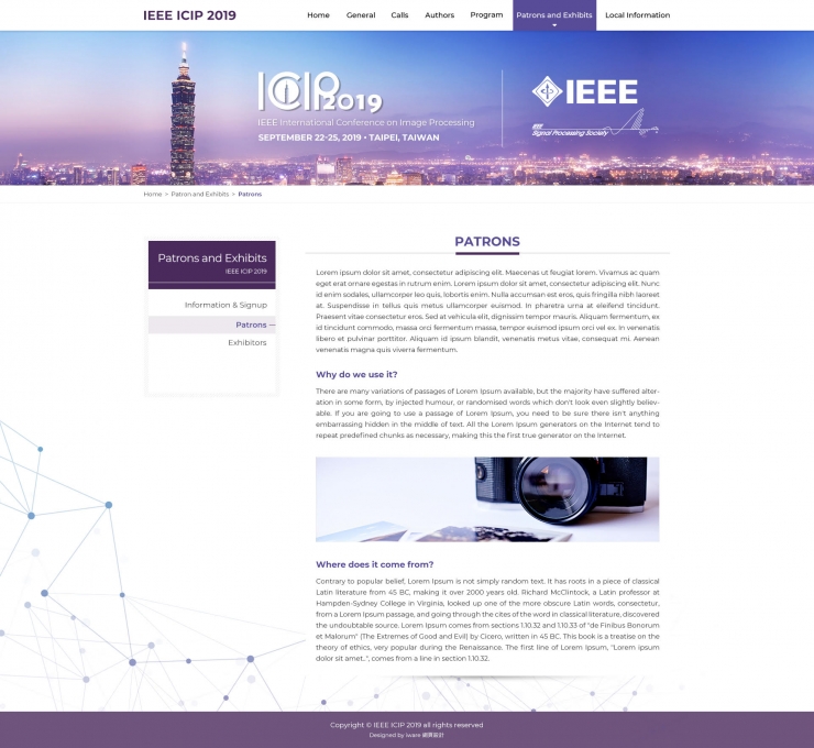 全部作品 精選作品 企業形象 購物網站 投審稿系統 客製平台 醫療美容 餐飲旅宿 教育/協會/政府 活動網站 RWD響應式 賀卡 3D環景攝影 首頁 iWare作品 ICIP2019大會官網 ICIP2019大會官網 介紹 第26屆 2019年度IEEE國際影像處理研討會 製作團隊:規劃/Hannah, 設計/Trista, 程式/Joe 功能項目 研討會形象官網 議程相關 會議相關資訊佈達 贊助廠商呈現 旅遊資訊參考 產業分類 RWD響應式 投審稿系統 瑞元企業社 精選作品 購物網站 RWD響應式 ATCSA2019 大會官網 RWD響應式 投審稿系統