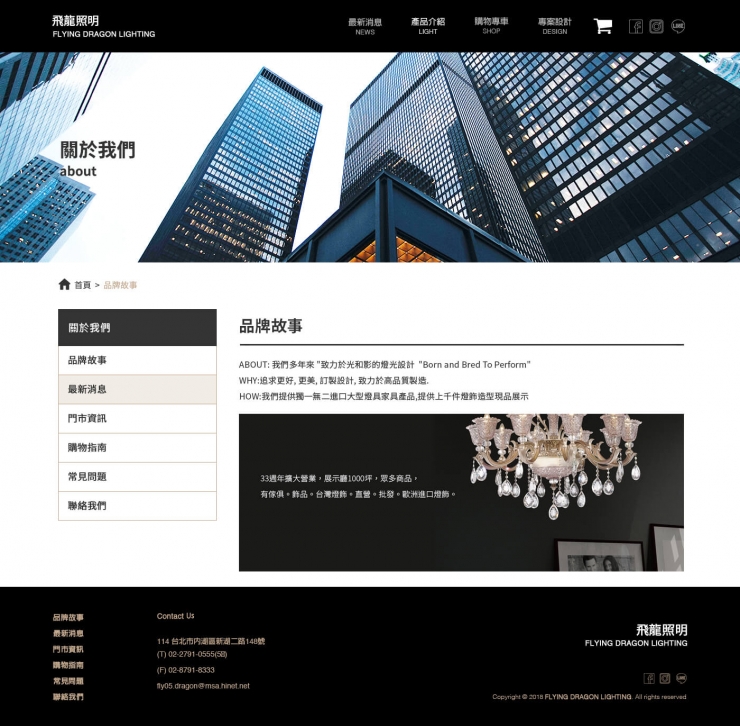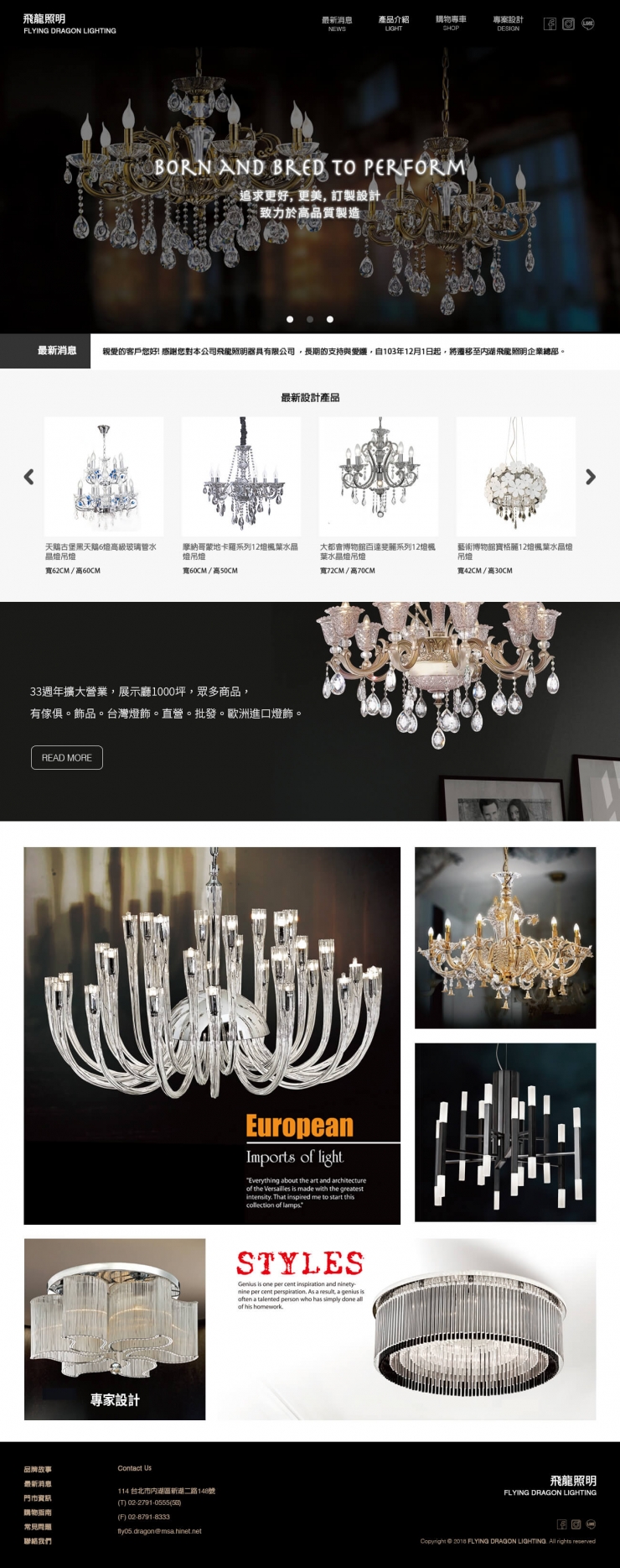 全部作品 精選作品 企業形象 購物網站 投審稿系統 客製平台 醫療美容 餐飲旅宿 教育/協會/政府 活動網站 RWD響應式 賀卡 3D環景攝影 首頁 iWare作品 飛龍照明器具有限公司 飛龍照明器具有限公司 介紹 飛龍照明器具有限公司專營製造生產各式各樣燈具零組件與燈飾配件, 提供專業燈具照明設計 製圖 生產規劃並經營代理歐洲進口燈飾, 在LED領域上不斷求新求變, 公司成立三十餘年來不斷改革、推陳出新,秉持創新設計、研發生產的企業經營理念,堅持卓越品質,是值得信賴的證明領域。 製作團隊:規劃/Amber, 切版/Karen, 程式/Joe 功能項目 形象圖輪播 關於我們 最新消息 產品上架 線上刷卡 產業分類 精選作品 購物網站 RWD響應式 鍍昇生技顧問股份有限公司 企業形象 RWD響應式 國立中央大學智慧生產設備及系統技術整合應用教學策略聯盟中心 RWD響應式 教育/協會/政府