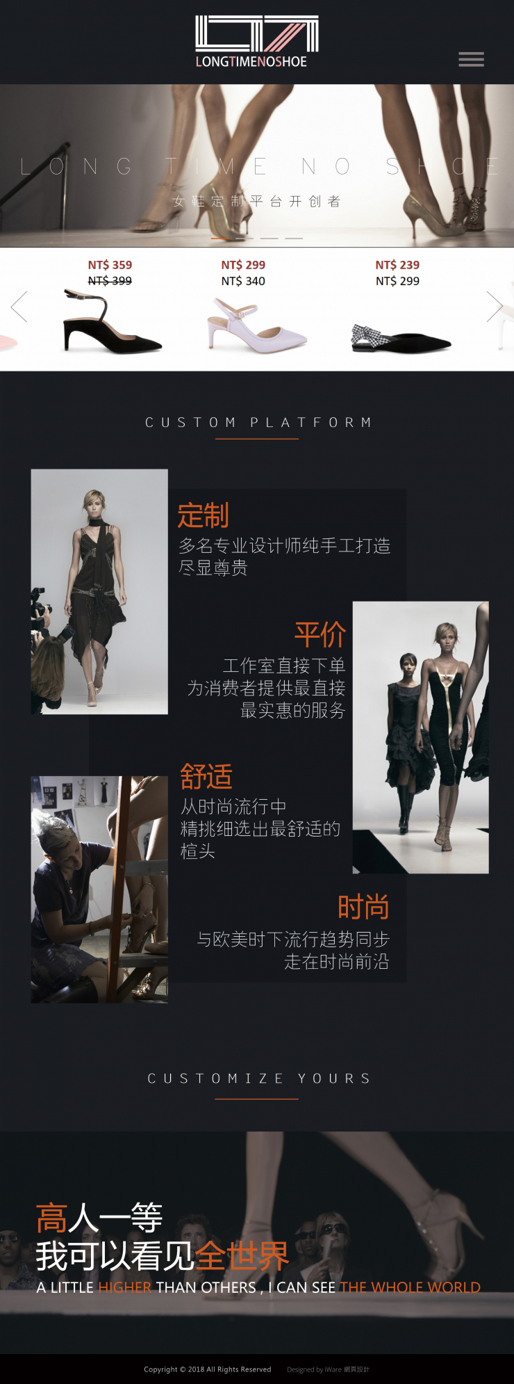 全部作品 精選作品 企業形象 購物網站 投審稿系統 客製平台 醫療美容 餐飲旅宿 教育/協會/政府 活動網站 RWD響應式 賀卡 3D環景攝影 首頁 iWare作品 東莞市愛美蘭貿易有限公司(購物網) 東莞市愛美蘭貿易有限公司(購物網) 介紹 longtimenoshoe好久沒鞋,台灣自主品牌,only真皮,always輕熟,即定即製,工廠直送,時尚舒適平價手工訂製女鞋 製作團隊:規劃/Amber, 切版/Trista 程式/Austin 功能項目 形象圖輪播 會員 購物車 金流串接 產業分類 購物網站 AAO2020 美國眼科年度研討會 醫療美容 RWD響應式 門諾醫院公益網站 精選作品 醫療美容 RWD響應式