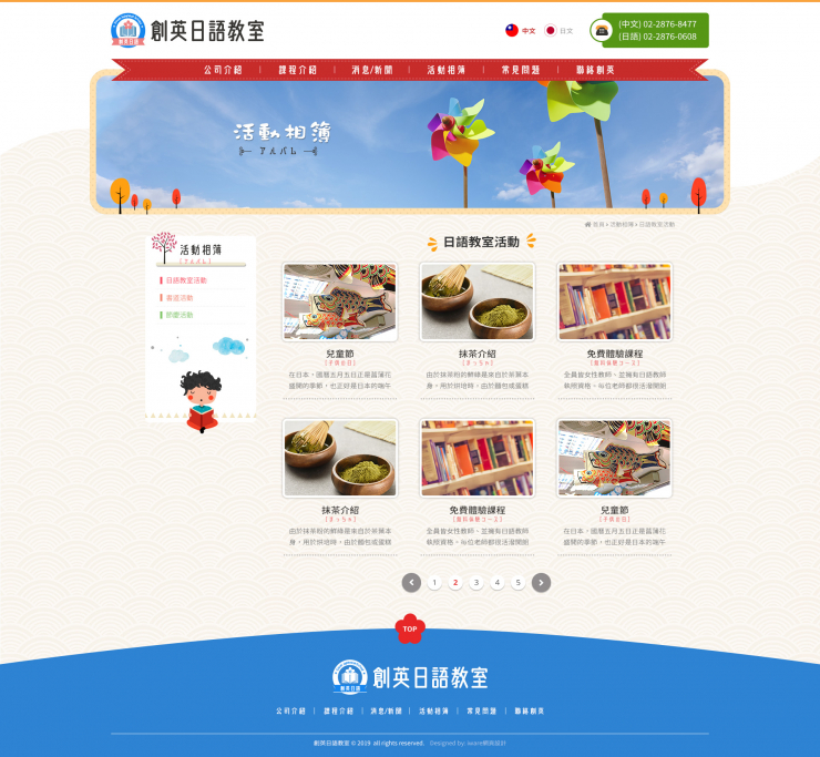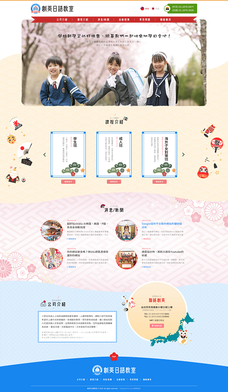 全部作品 精選作品 企業形象 購物網站 投審稿系統 客製平台 醫療美容 餐飲旅宿 教育/協會/政府 活動網站 RWD響應式 賀卡 3D環景攝影 首頁 iWare作品 創英文教股份有限公司 創英文教股份有限公司 介紹 創英日語教室,天母地區20年日語教學歷史,全員日籍老師,強大的日本創英教育集團資源,最高級別最專業的日語。 設有臺灣唯一日本習字認可書道班和針對日本人學校學習塾。 開創日語新品牌。 製作團隊:規劃/Amber, 設計/Trista, 程式/Billy 功能項目 形象圖輪播 課程介紹 消息新聞 活動相簿 預約表單 產業分類 RWD響應式 教育/協會/政府 星加電機工業有限公司 企業形象 形象型網站 清河國際 企業形象 原創功能型網站