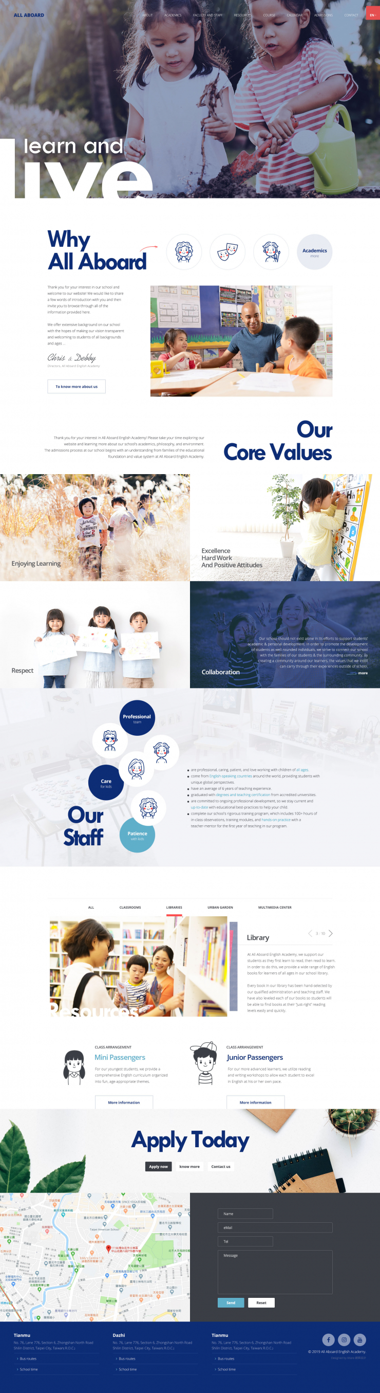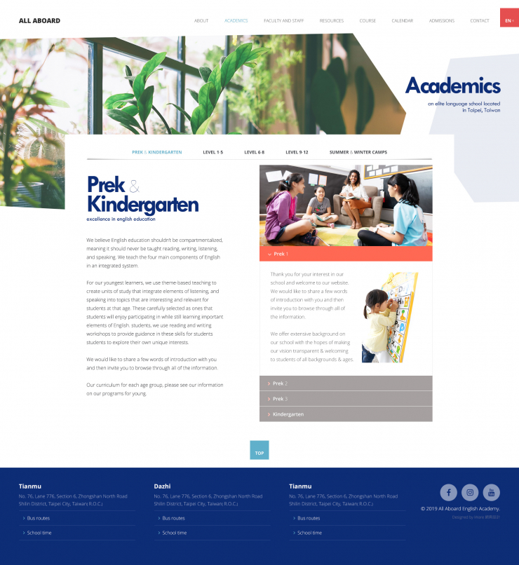 在 All Aboard English Academy, 你可以預期看見以語言藝術學習為基礎,每個年級的課程都完美與進階的課程完美銜接,從學齡前至幼稚園課程設計,乃至小學、中學、高中,以及大學入學前的課綱,我們的課綱設計與美國的共同核心教學標準(Common Core State Standards)之英語藝術學科一致,以確保學生在合適卻又不失挑戰性的課程中持續英語的學習,為日後出國留學或是與國外人士溝通奠定基礎。