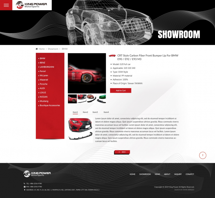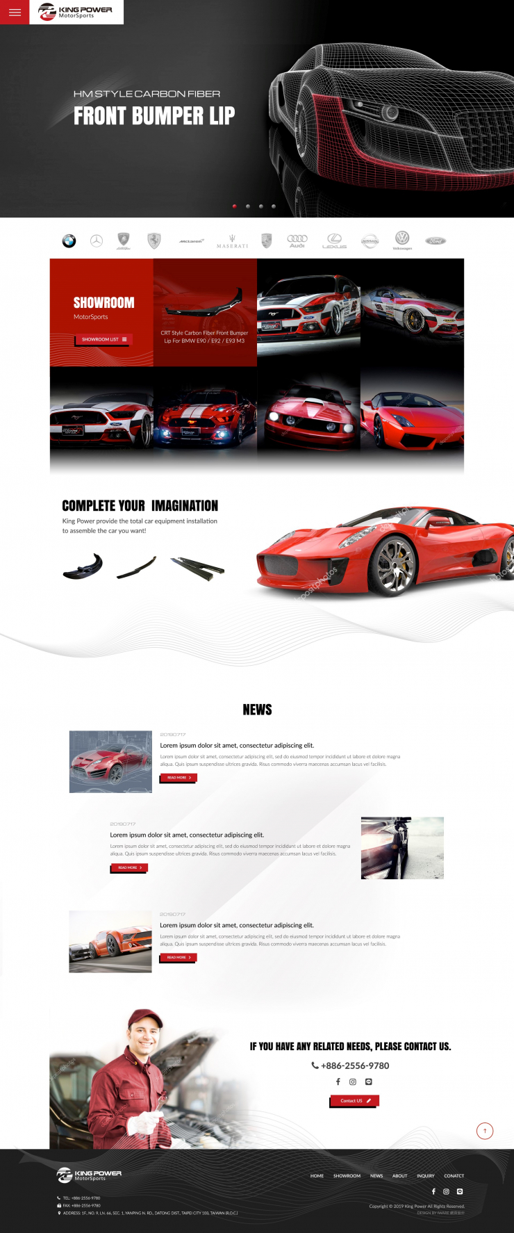 全部作品 精選作品 企業形象 購物網站 投審稿系統 客製平台 醫療美容 餐飲旅宿 教育/協會/政府 活動網站 RWD響應式 賀卡 3D環景攝影 首頁 iWare作品 擎利國際有限公司 擎利國際有限公司 介紹 King Power 是專業的改裝汽配套件設計, 製造與進出口一條龍作業的公司, 座落於台灣新北市泰山區,我們擁有自己的工廠,從開模到製造後的進出口甚至是最後的安裝都由King Power一條龍包辦。 製作團隊:規劃/Lori, 設計/Winnie, 前端/Erica, 程式/Billy 功能項目 中、英文二個語系 RWD網站 幻燈片管理 單層頁面管理 二層網頁生成管理 產品上架管理 詢價車管理 表單管理 產業分類 企業形象 RWD響應式 宏普人力資源股份有限公司 企業形象 RWD響應式 盛泰防災工業股份有限公司 精選作品 企業形象 形象型網站