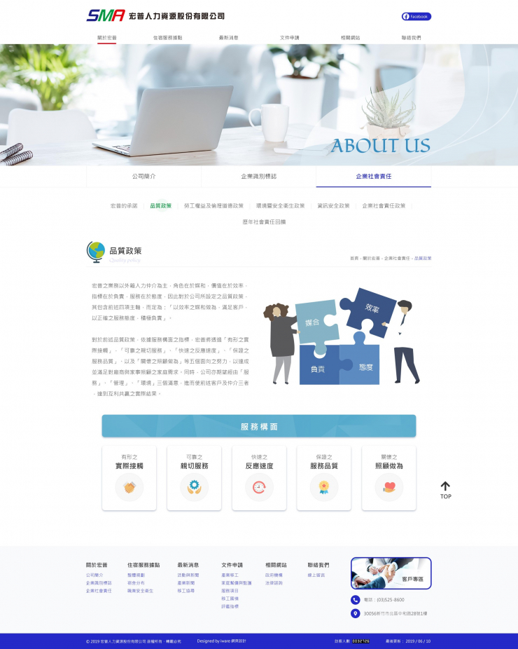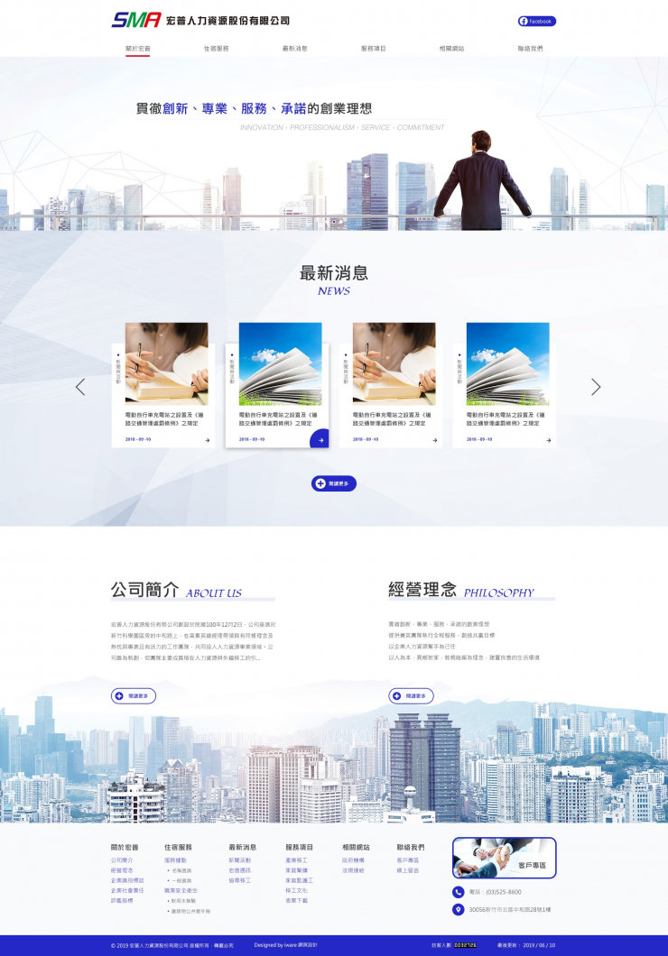 全部作品 精選作品 企業形象 購物網站 投審稿系統 客製平台 醫療美容 餐飲旅宿 教育/協會/政府 活動網站 RWD響應式 賀卡 3D環景攝影 首頁 iWare作品 宏普人力資源股份有限公司 宏普人力資源股份有限公司 介紹 宏普人力資源股份有限公司創設於民國100年12月2日,公司座落於新竹科學園區旁的中和路上, 在高素英總經理帶領具有同樣理念及熱忱與專業且有活力的工作團隊,共同投入人力資源事業領域。 製作團隊:規劃/Lori, 設計&前端/Karen, 程式/Yuwei 功能項目 RWD網站 幻燈片管理 單層頁面管理 二層網頁生成管理 表單管理 產業分類 企業形象 RWD響應式 田晉五金製品股份有限公司 精選作品 RWD響應式 擎利國際有限公司 企業形象 RWD響應式