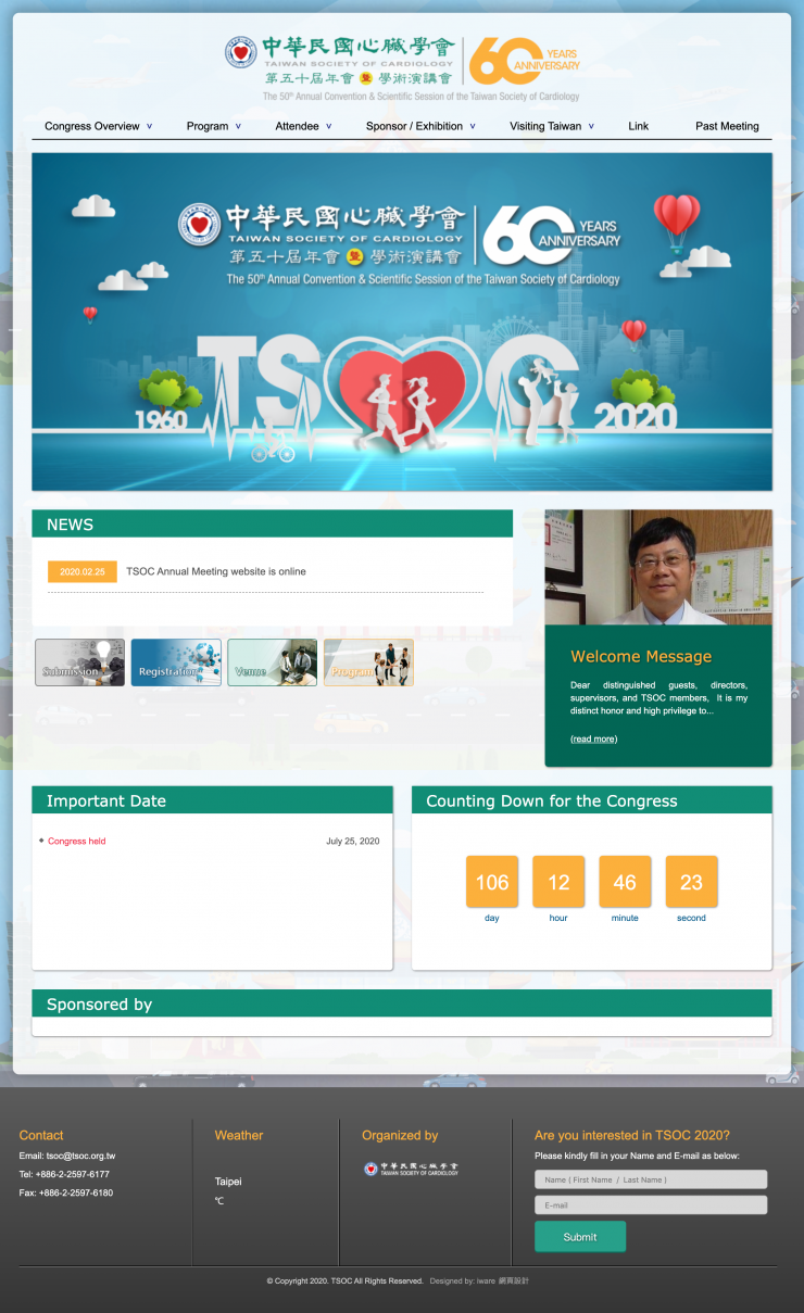 全部作品 精選作品 企業形象 購物網站 投審稿系統 客製平台 醫療美容 餐飲旅宿 教育/協會/政府 活動網站 RWD響應式 賀卡 3D環景攝影 首頁 iWare作品 社團法人中華民國心臟學會(TSOC)-年會官網 社團法人中華民國心臟學會(TSOC)-年會官網 介紹 社團法人中華民國心臟學會第50屆年會暨學術演講會 製作團隊:規劃/Hannah、 設計/Trista、程式/Carol 功能項目 Congress Information Program Attendee Visiting Taiwan Link Past Meeting 產業分類 RWD響應式 教育/協會/政府 原創功能型網站 財團法人圓光文教基金會-圓光禪寺 RWD響應式 教育/協會/政府 原創功能型網站 衛生福利部疾病管制署唾篩超商系統 教育/協會/政府 原創功能型網站