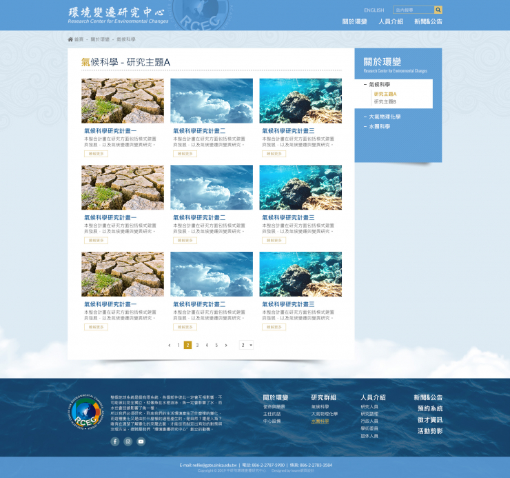 全部作品 精選作品 企業形象 購物網站 投審稿系統 客製平台 醫療美容 餐飲旅宿 教育/協會/政府 活動網站 RWD響應式 賀卡 3D環景攝影 首頁 iWare作品 中央研究院環境變遷中心 中央研究院環境變遷中心 介紹 環變中心初期研究內容包括大氣組成及大氣輻射收支的變遷、全球氣候系統的變化、 台灣周邊海域之生物地球化學等領域,並且針對亞洲大陸的沙塵暴傳輸、 台灣的臭氧生成與空氣污染、全球暖化情境下降水系統的變化、 以及海洋酸化對珊瑚礁系統的影響等重要環境議題進行了多元的探討。 製作團隊:規劃/Amber, 設計&前端/Trisat, 程式/Billy 功能項目 RWD網站 關於我們 人員介紹 研究成果 預約系統 新聞公告 活動剪影 徵才資訊 產業分類 RWD響應式 教育/協會/政府 真善美國際旅行社 企業形象 康詠衛生資訊有限公司(365健康資訊家) 精選作品 RWD響應式