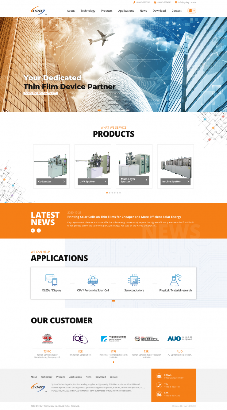 Syskey Technology Co.,Ltd.是用於研發和工業生產的高質量薄膜設備的領先供應商。Syskey產品組合包括手動,半自動或全自動解決方案中的濺射,電子束,熱蒸發器,ALD,PEALD,RIE,PECVD和LPCVD。我們的優勢之一是根據客戶需求定制和實現薄膜系統。我們堅信為客戶提供優質的產品和誠實的服務,並與我們的全球客戶建立了令人羨慕的聲譽和可靠性。取得成功之後,Syskey會繼續開發最佳設備,以滿足我們客戶當今和未來的需求