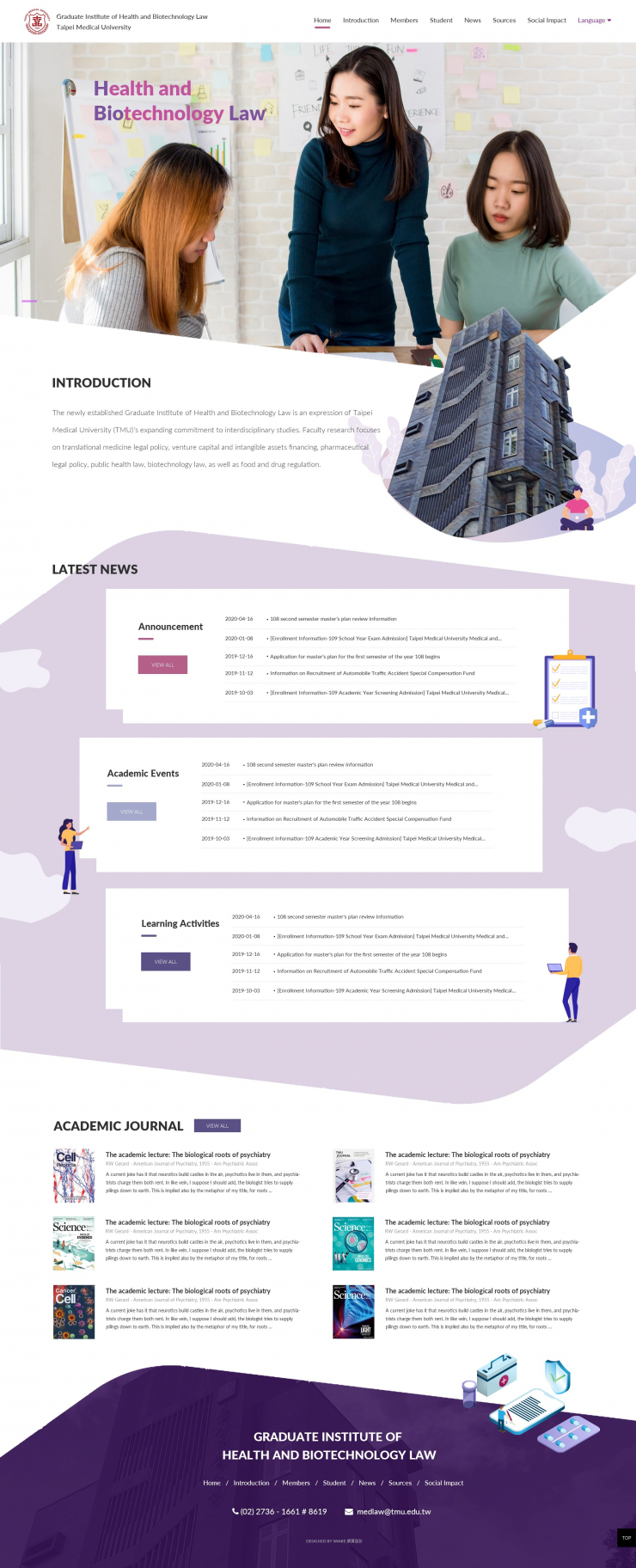 全部作品 精選作品 企業形象 購物網站 投審稿系統 客製平台 醫療美容 餐飲旅宿 教育/協會/政府 活動網站 RWD響應式 賀卡 3D環景攝影 首頁 iWare作品 臺北醫學大學-醫療暨生物科技法律研究所 臺北醫學大學-醫療暨生物科技法律研究所 介紹 醫療暨生物科技法律研究所之教學目標為培養法律系學生具備從事醫藥、衛生、生物科技相關工作之能力,促進醫藥、衛生領域與法律領域之人才交流。 製作團隊:規劃/LORI, 設計&前端/Winnie, 程式/Austin 功能項目 最新消息 系所簡介 師資陣容 教學與研究 招生資訊 學生與校友 國際交流 網站地圖 全站搜尋 聯絡我們 產業分類 RWD響應式 教育/協會/政府 財團法人法律扶助基金會 CRPD身心障礙者無障礙網站 RWD響應式 教育/協會/政府 原創功能型網站 積佳科技股份有限公司 企業形象 RWD響應式