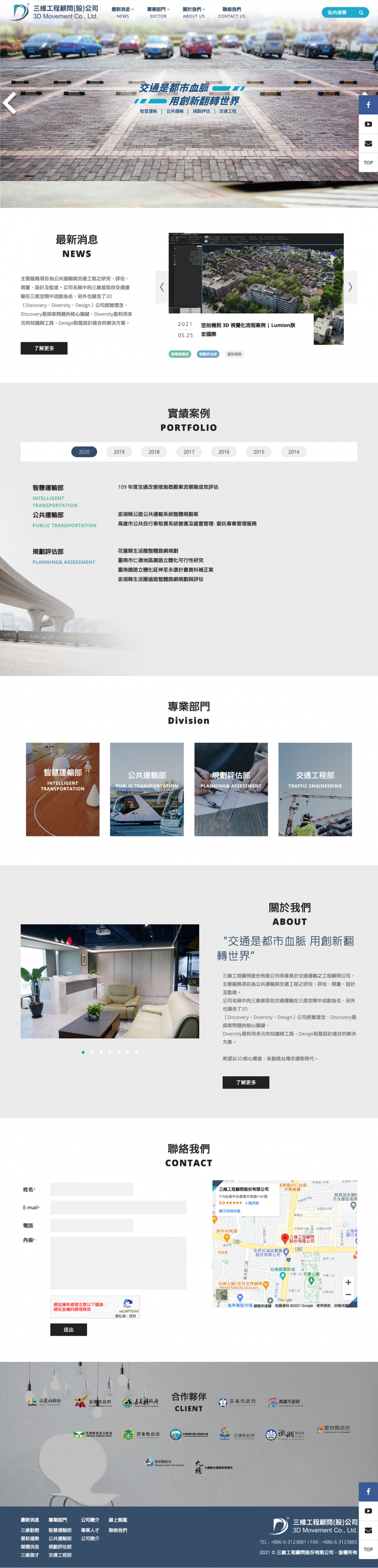 全部作品 精選作品 企業形象 購物網站 投審稿系統 客製平台 醫療美容 餐飲旅宿 教育/協會/政府 活動網站 RWD響應式 賀卡 3D環景攝影 首頁 iWare作品 三維工程顧問股份有限公司 三維工程顧問股份有限公司 介紹 三維工程顧問股份有限公司目前主要服務項目為交通運輸之調查、研究、評估、規劃、設計、監造與專案管理。為國內少數具備智慧運輸(ITS)設計監造能力,率先引入無人機(UAV)調查與環境建模技術(3D Point Cloud),並且具備巨觀都市交通規劃(VISUM)與微觀車流模擬分析(VISSIM)能力,領先業界提供綜合交通議題之改善方案。 製作團隊:規劃/Hannah, 設計/Katie、Winnie 程式/Akira 功能項目 動態形象首頁 最新訊息 專業服務 實績案例 時間軸 專業人才 聯絡我們 產業分類 精選作品 RWD響應式 來頡科技股份有限公司 企業形象 RWD響應式 大苑藝術會展有限公司 企業形象 RWD響應式 教育/協會/政府
