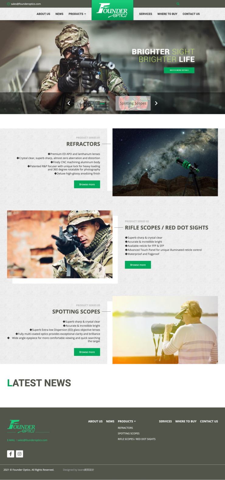 全部作品 精選作品 企業形象 購物網站 投審稿系統 客製平台 醫療美容 餐飲旅宿 教育/協會/政府 活動網站 RWD響應式 賀卡 3D環景攝影 首頁 iWare作品 龍鵬實業有限公司 龍鵬實業有限公司 介紹 龍鵬實業有限公司為全台灣最專業的望遠鏡、瞄準鏡製造商,秉持品質第一的原則,採用世界知名專業廠所設計之光學系統、高度消色差鏡片,以高精密光學檢驗儀器及專業機械加工設備製造產品。提供使用者加倍清晰且真實優質的觀測影像。 製作團隊:規劃/Hannah, 設計/Ringo、Trista 程式/Austin 功能項目 動態形象首頁 最新訊息 三大類產品 實績案例 服務據點 專業人才 聯絡我們 產業分類 精選作品 RWD響應式 廣鵬科技有限公司 企業形象 祥齊電子有限公司 精選作品 RWD響應式