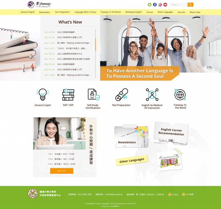 全部作品 精選作品 企業形象 購物網站 投審稿系統 客製平台 醫療美容 餐飲旅宿 教育/協會/政府 活動網站 RWD響應式 賀卡 3D環景攝影 首頁 iWare作品 台灣大學 E-freeway 線上外語自學教室網站 台灣大學 E-freeway 線上外語自學教室網站 介紹 規劃/Lori, 視覺&前端/Peng & Winnie, 程式/Carol 功能項目 General English Newsletters Test Preparation Course Site Info What’s New 產業分類 RWD響應式 教育/協會/政府 葡眾企業股份有限公司 精選作品 醫療美容 RWD響應式 中華民國防癆協會 精選作品 RWD響應式 教育/協會/政府