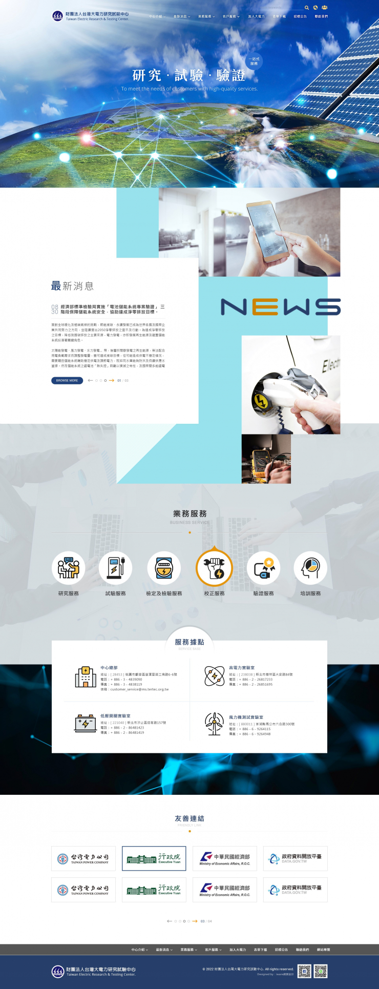 全部作品 精選作品 企業形象 購物網站 投審稿系統 客製平台 醫療美容 餐飲旅宿 教育/協會/政府 活動網站 RWD響應式 賀卡 3D環景攝影 首頁 iWare作品 財團法人台灣大電力研究試驗中心 財團法人台灣大電力研究試驗中心 介紹 中心係依據1975年經濟部孫前部長運璿召開「發展電機工業座談會」指示成立「斷路器試驗之財團法人試驗中心」,1978年行政院「科學技術會議」決議成立「重電機高電壓檢驗中心」,後由台灣電力公司與國內十三家重電機製造業聯合捐助,於1979年4月正式成立,係一非營利性質之經濟事務財團法人機構 製作團隊:規劃/Hannah, 設計/Ringo、Karen 程式/Carol 功能項目 各單元資訊佈達 線上報名 檔案下載 員工內網 線上會議室預約 線上派車預約 系統串接 產業分類 精選作品 RWD響應式 教育/協會/政府 震旦.未來辦公式|Image Your Future 3D環景攝影 來頡科技股份有限公司 企業形象 RWD響應式