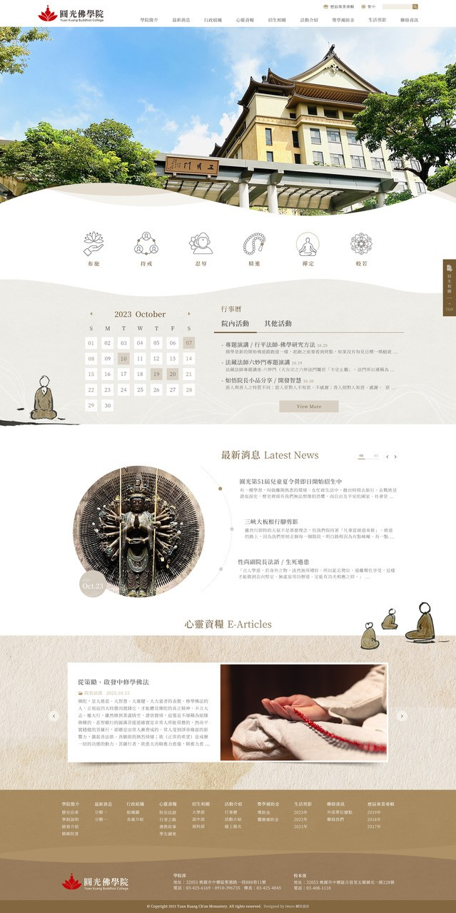 全部作品 精選作品 企業形象 購物網站 投審稿系統 客製平台 醫療美容 餐飲旅宿 教育/協會/政府 活動網站 RWD響應式 賀卡 3D環景攝影 首頁 iWare作品 財團法人圓光文教基金會(圓光佛學院) 財團法人圓光文教基金會(圓光佛學院) 介紹 圓光佛學院 辦學教育理念為 以傳統叢林教育宏規,配合現代教育方法,結合運用科技、培養健全僧格、住持道場、弘揚正法、服務社會、淨化人心之僧才。 培植佛門人才, 俾使佛教教育長久發展,積極充實軟硬體設備,為達理想的教育環境而努力。 規劃/Hannah, 設計/Peng、Winnie、Michelle 程式/Billy 功能項目 學院簡介 最新消息 文章資訊 行事曆 活動介紹 線上報名 相簿功能 產業分類 RWD響應式 教育/協會/政府 華證科技股份有限公司 精選作品 RWD響應式 深圳市桐毅信息科技有限公司 企業形象 RWD響應式