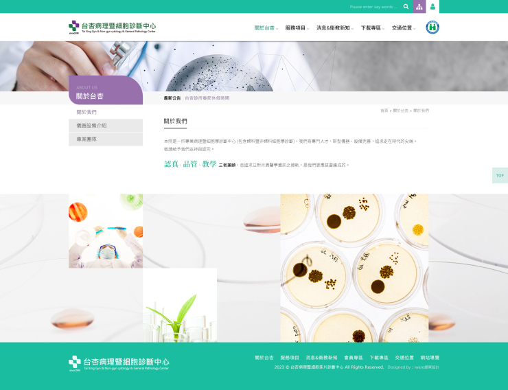 全部作品 精選作品 企業形象 購物網站 投審稿系統 客製平台 醫療美容 餐飲旅宿 教育/協會/政府 活動網站 RWD響應式 賀卡 3D環景攝影 首頁 iWare作品 台杏病理暨細胞抹片診斷中心 台杏病理暨細胞抹片診斷中心 介紹 製作團隊:規劃/Amber, 視覺&前端/Katie, Trista, 程式/Austin 功能項目 關於台杏 服務項目 消息&衛教新知 下載專區 交通位置 會員專區(登入/病切報告查詢&匯出/抹片報告查詢/條件篩選) 產業分類 精選作品 醫療美容 RWD響應式 育達科技大學 RWD響應式 教育/協會/政府 投審稿系統 司碼瀷互動包材股份有限公司 企業形象 RWD響應式