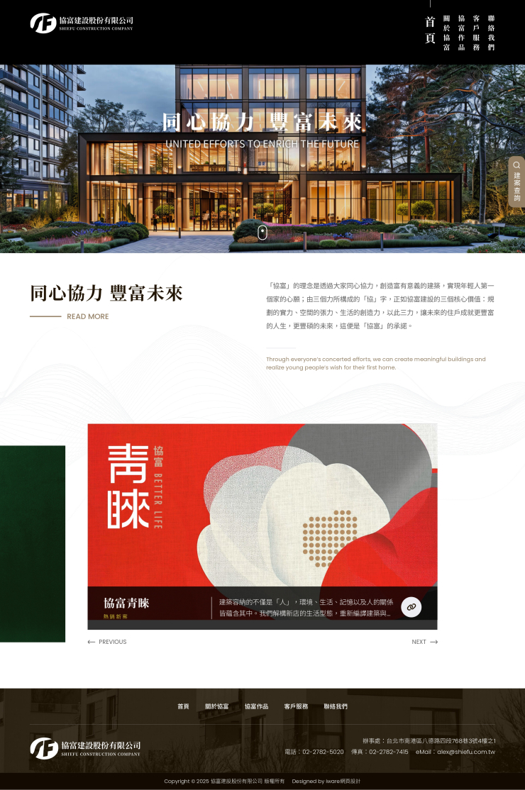 全部作品 精選作品 企業形象 購物網站 投審稿系統 客製平台 醫療美容 餐飲旅宿 教育/協會/政府 活動網站 RWD響應式 賀卡 3D環景攝影 首頁 iWare作品 協富建設股份有限公司 協富建設股份有限公司 介紹 「協富」的理念是透過大家同心協力,創造富有意義的建築,實現年輕人第一個家的心願;由三個力所構成的「協」字,正如協富建設的三個核心價值:規劃的實力、空間的張力、生活的創造力,以此三力,讓未來的住戶成就更豐富的人生,更豐碩的未來,這便是「協富」的承諾。 規劃/Mina, 設計/Trista 程式/Austin 功能項目 首頁動畫 關於協富 協富作品 客戶服務 聯絡我們 產業分類 精選作品 RWD響應式 詠樂商行 企業形象 RWD響應式 信曜科技股份有限公司 企業形象 RWD響應式