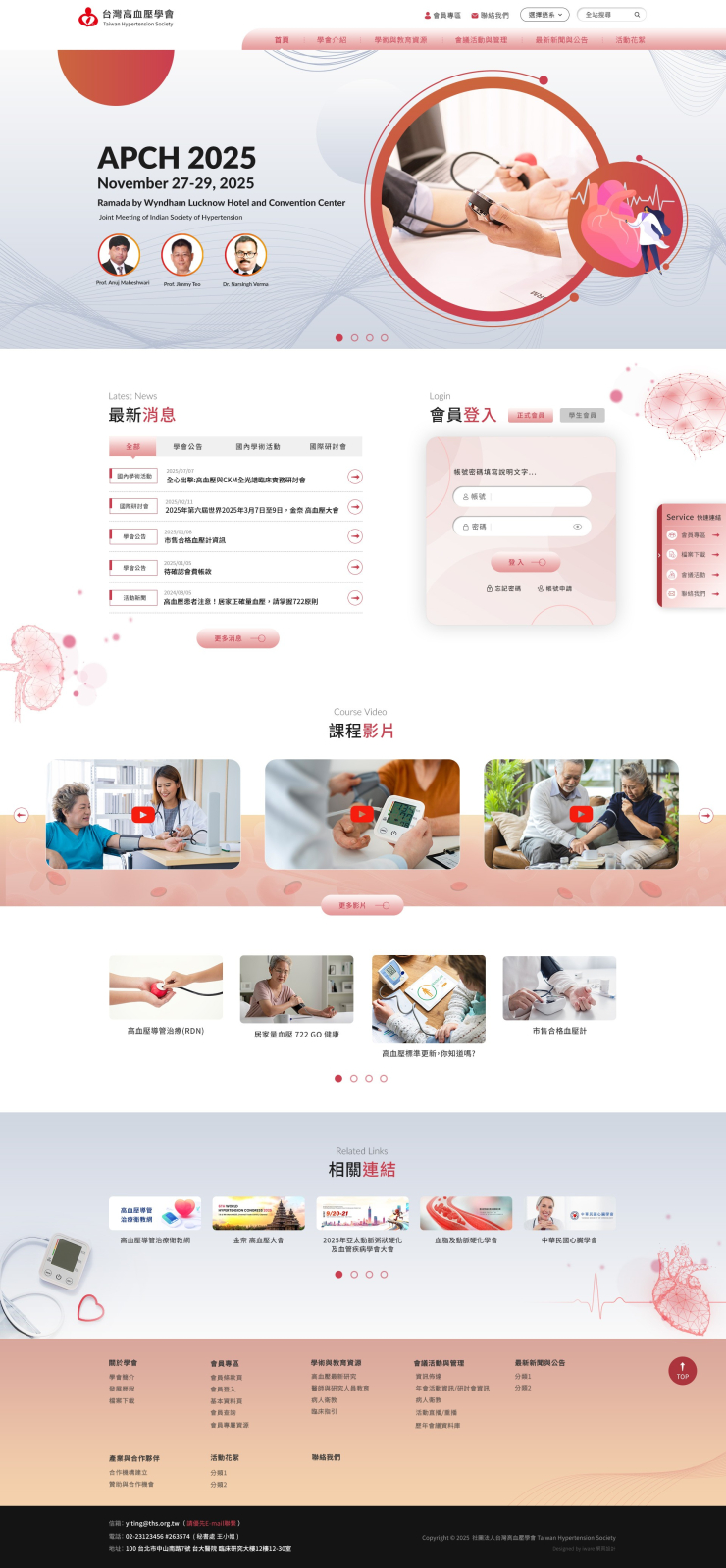 全部作品 精選作品 企業形象 購物網站 投審稿系統 客製平台 醫療美容 餐飲旅宿 教育/協會/政府 活動網站 RWD響應式 賀卡 3D環景攝影 首頁 iWare作品 社團法人台灣高血壓學會 社團法人台灣高血壓學會 介紹 台灣高血壓學會係以聯絡國內外人士共同促進高血壓及相關心血管疾病之教育、研究、診治與預防為宗旨。台灣高血壓學會致力於高血壓防治之研究與推廣,定期舉辦國內及國際學術活動,提供醫界、學界、廠商一個交流園地,期望協同各界資源,提升高血壓預防與治療的水準。 規劃/Hannah, 設計/Winnie 程式/Austin 功能項目 關於學會 會員專區 線上課程 線上報名 檔案下載 最新新聞 活動花絮 活動影片 產業分類 精選作品 客製平台 教育/協會/政府 國立臺灣師範大學教育學系教育研究集刊 精選作品 客製平台 教育/協會/政府