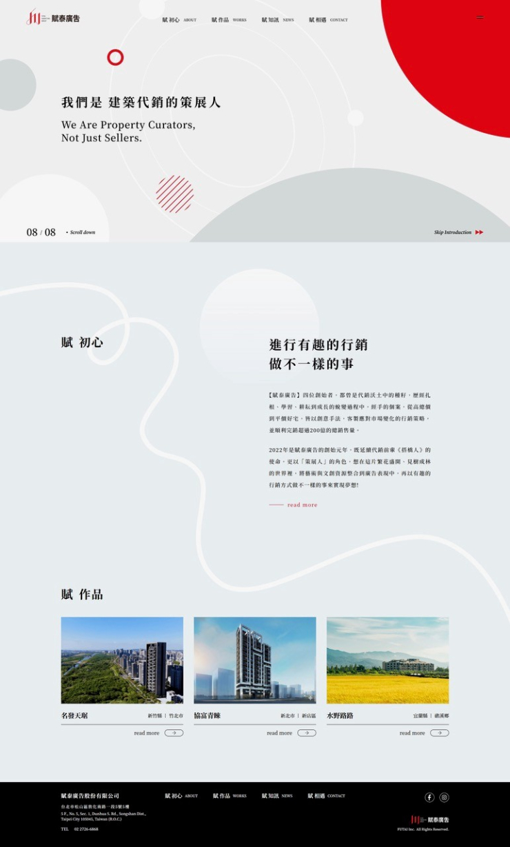 全部作品 精選作品 企業形象 購物網站 投審稿系統 客製平台 醫療美容 餐飲旅宿 教育/協會/政府 活動網站 RWD響應式 賀卡 3D環景攝影 首頁 iWare作品 賦泰廣告股份有限公司 賦泰廣告股份有限公司 介紹 規劃/Mina, 前端 Trista, 程式/ Austin 功能項目 首頁動畫 關於我們 作品案例 最新消息 聯絡我們 產業分類 企業形象 RWD響應式 社團法人台灣高血壓學會 精選作品 客製平台 教育/協會/政府