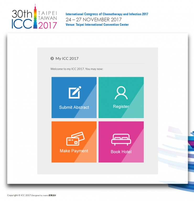 全部作品 精選作品 企業形象 購物網站 投審稿系統 客製平台 醫療美容 餐飲旅宿 教育/協會/政府 活動網站 RWD響應式 賀卡 3D環景攝影 首頁 iWare作品 ICC2017 ICC2017 介紹 It is a great pleasure and privilege to invite you to the 30th International Congress of Chemotherapy and Infection 2017 (ICC 2017) which will take place at Taipei International Convention Center (TICC) in Taipei, Taiwan from 24 to 27 November 2017. 產業分類 投審稿系統 AFSLAB 2016 投審稿系統 POA 2017 投審稿系統