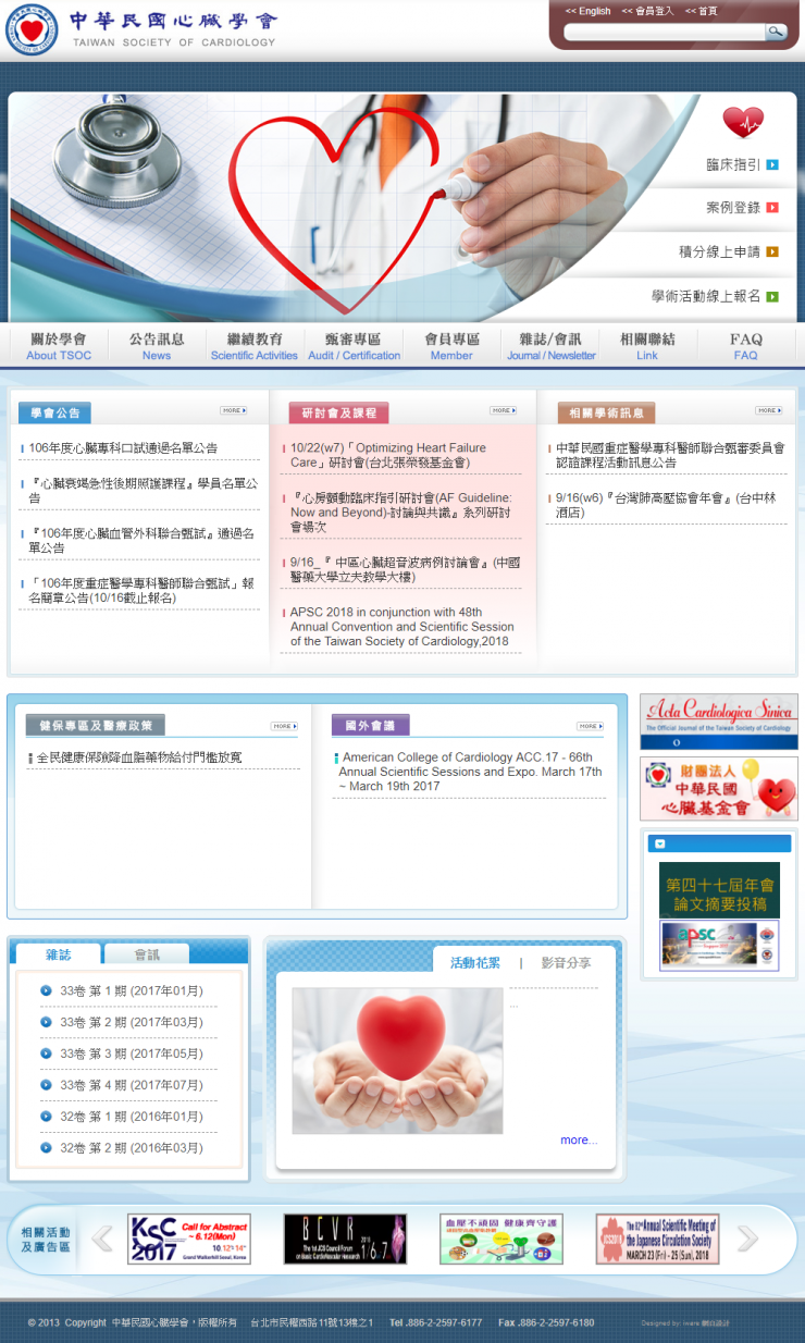 全部作品 精選作品 企業形象 購物網站 投審稿系統 客製平台 醫療美容 餐飲旅宿 教育/協會/政府 活動網站 RWD響應式 賀卡 3D環景攝影 首頁 iWare作品 中華民國心臟學會 中華民國心臟學會 介紹 針對心臟學各領域之快速專業化,我們已深深覺悟心臟科「全人化」醫療的再思考已是刻不容緩。本屆的心臟學會教學或新知活動,將特別強調不同領域間的共同治療準則討論,譬如:冠心症之內外科介入治療共同準則、心衰竭內科用藥與節律器使用、心室輔助器、心臟移植間的時程配合,心律不整治療與高血壓、心衰竭、體重控制的綜效,甚至高血壓新準則在SPRINT後的再出發。我們心臟學會不只是在各專業subspecialty要更加精準,也必須回歸原有心臟內、外、兒科學的廣泛學習,提昇全人心臟醫療的根本能力。 產業分類 醫療美容 APRIM 2017 投審稿系統 台美檢驗科技有限公司 醫療美容 RWD響應式