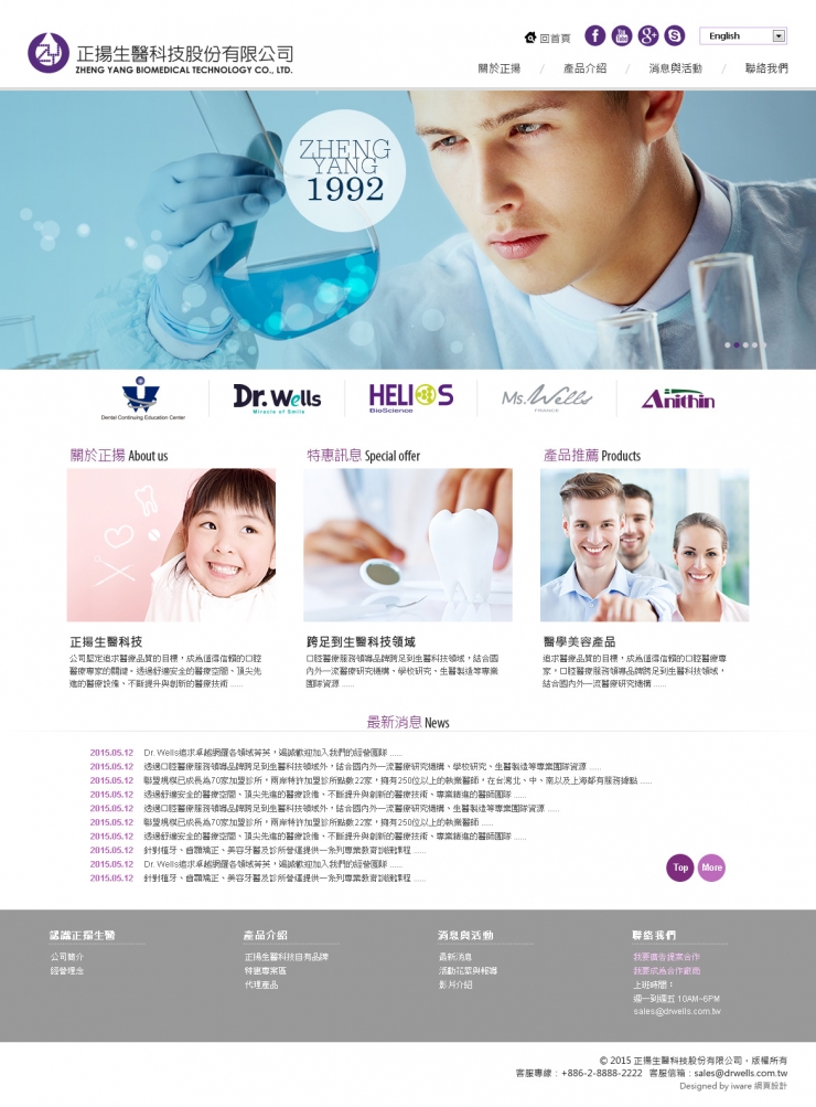 全部作品 精選作品 企業形象 購物網站 投審稿系統 客製平台 醫療美容 餐飲旅宿 教育/協會/政府 活動網站 RWD響應式 賀卡 3D環景攝影 首頁 iWare作品 正揚生醫 正揚生醫 介紹 「正揚生醫科技股份有限公司」是由國維牙醫診所的曾育弘董事長2004年發起,集結了國內醫界精英一起共同創立,公司組織劃分為 「生醫科技」與「Dr. Wells牙醫連鎖診所群 」兩大發展事業體。 產業分類 醫療美容 血脂及動脈硬化學會 醫療美容 合世生醫 精選作品 醫療美容 RWD響應式