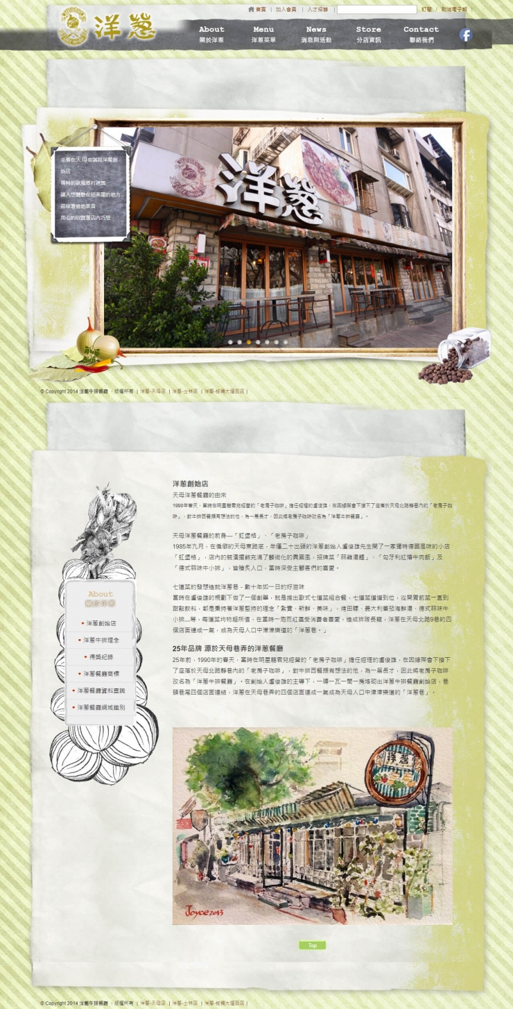 全部作品 精選作品 企業形象 購物網站 投審稿系統 客製平台 醫療美容 餐飲旅宿 教育/協會/政府 活動網站 RWD響應式 賀卡 3D環景攝影 首頁 iWare作品 洋蔥餐廳 洋蔥餐廳 介紹 25年前,1990年的春天,當時在明星龍君兒經營的「老房子咖啡」擔任經理的盧俊雄,在因緣際會下接下了座落於天母北路靜巷內的「老房子咖啡」,對牛排西餐頗有想法的他,為一展長才,因此將老房子咖啡改名為「洋蔥牛排餐廳」。在創始人盧俊雄的主導下,一磚一瓦一間一房堆砌出洋蔥牛排餐廳創始店,巷頭巷尾四個店面連結,洋蔥在天母巷弄的四個店面連成一氣成為天母人口中津津樂道的「洋蔥巷」。 產業分類 餐飲旅宿 共同存在 餐飲旅宿 RWD響應式 打狗戀館 餐飲旅宿 RWD響應式