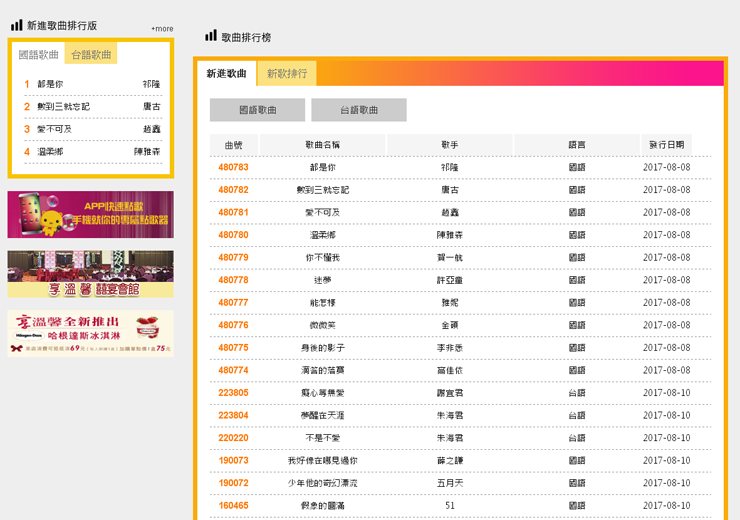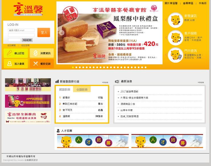 全部作品 精選作品 企業形象 購物網站 投審稿系統 客製平台 醫療美容 餐飲旅宿 教育/協會/政府 活動網站 RWD響應式 賀卡 3D環景攝影 首頁 iWare作品 KTV排行榜 KTV排行榜 介紹 透過後台資訊庫與客戶端系統自動串接,轉拋程式資料到網站主機,自動更新. 功能項目 會員資料庫 系統資料庫串接 線上訂位 產業分類 客製平台 簡易ERP系統 客製平台 人時審核系統 客製平台